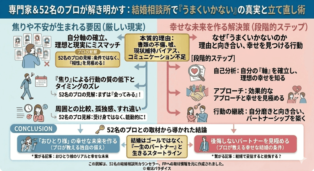 この記事では、結婚相談所での婚活がうまくいかない具体的な原因と、実践的な解決策をお伝えします。
