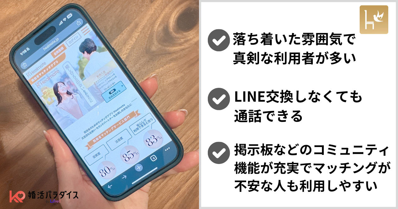 Healmate(ヒールメイト)は、その名の通り「心を癒す」ことをコンセプトにしたマッチングサイトです。代表自身が結婚生活で感じた孤独感から「心の拠り所になる場所を作りたい」という想いで立ち上げられました。