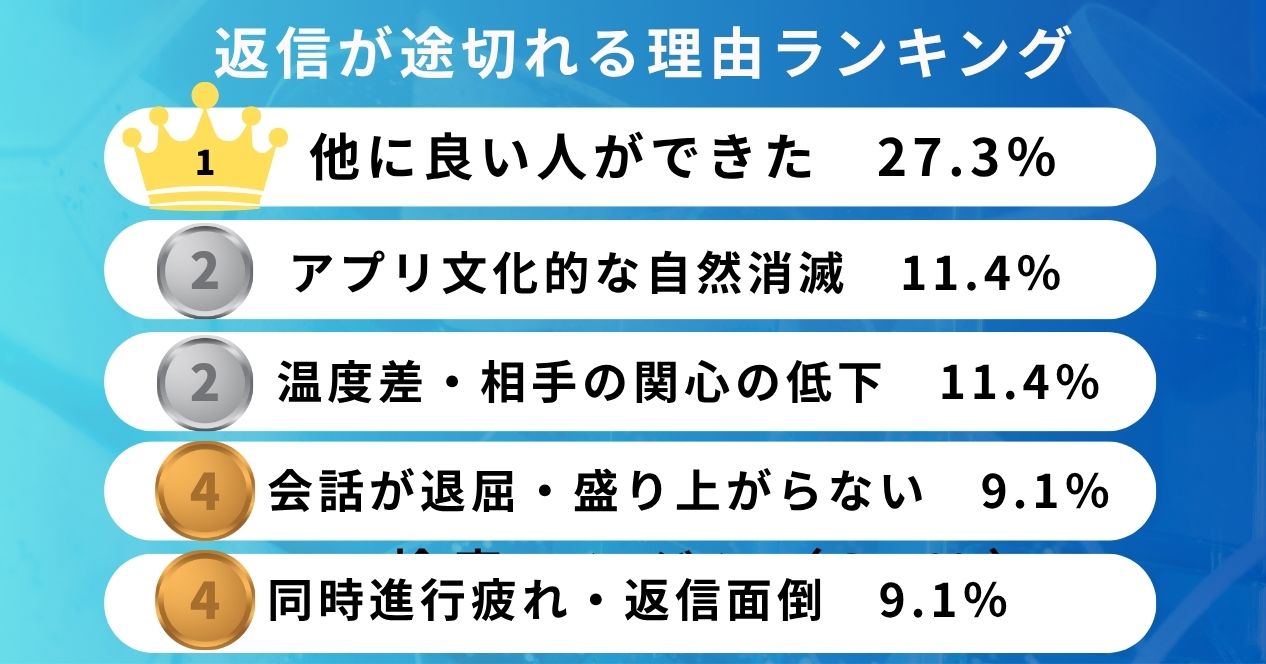 女性側からの指摘として「質問してこない男性」「プロフィールを読まない男性」に対して返信をやめるとの声が多い